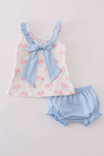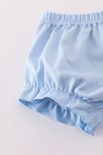 Get ready to bloo-m into style with our Blue Floral Bow Print Ruffle Bloomer Set! Perfect for your little one, this set features a charming blue floral print and adorable ruffle detailing. Add a touch of playfulness and charm to any outfit (and diaper change) with this cute and quirky bloomer set. (Seriously, it's ruff-ly that good.)