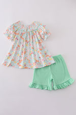 Get ready for spring with this playful and quirky green smocked girl set, featuring a charming bloom design. Perfect for adding a pop of color to any little girl's wardrobe. Stay stylish and comfortable all season long!