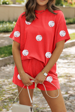 Stay stylish and comfortable this season with the Baseball Corded Set FB. This trendy two-piece features a loose t-shirt and matching pull-on shorts, both adorned with a fashionable baseball patch graphic. Crafted from quality fabric with a unique twisted rib texture, it offers a perfect blend of casual cool and cozy wearability. Ideal for everyday outings or relaxed weekends, this set keeps you looking fresh and feeling great.