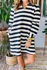 The Black Stripe Pocket Sweatshirt Dress FB combines sporty style with everyday comfort. Featuring a chic polo neck and a relaxed shift fit, it offers effortless wearability throughout your day. Crafted from soft sweatshirt fabric, this dress is perfect for casual outings. Pair it with boots or sneakers to complete a laid-back, fashionable look.