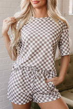 Upgrade your wardrobe with our Brown Checkered Set! This 2pcs set includes a trendy checkered tee and comfortable shorts. The loose fit and drop shoulder design of the tee provide ultimate comfort, while the elastic waistline with tie detail adds a touch of style. Stay on-trend and stylish with this must-have set!