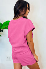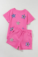 Celebrate in style with this Pink Patriotic Textured Set RTS. Featuring a vibrant strawberry pink hue, textured fabric, and sparkling sequined American star patches, this two-piece outfit combines festive charm with comfortable wear. Perfect for standout summer events or casual patriotic celebrations, it offers a unique blend of eye-catching detail and easy-to-wear design. Elevate your wardrobe with this fun and fashionable set today!