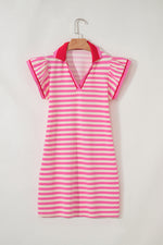 Elevate your wardrobe with the Stripe Contrast Dress. Featuring a vibrant stripe print and a chic split neck with a contrasting collar, this dress combines style and sophistication effortlessly. The flattering flutter sleeves create a feminine silhouette, while the short length makes it perfect for both casual outings and semi-formal events. Make a statement wherever you go with this eye-catching and versatile dress.